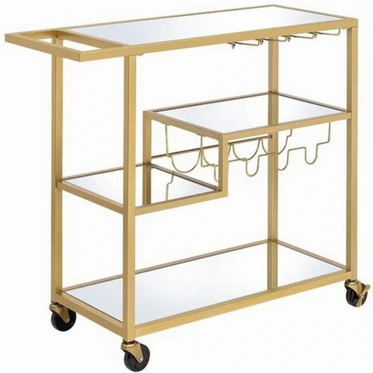 With its shimmering tiers, this Adamsen serving cart will catch the light for a stylish sparkle to complement neutral spaces. The clean-lined design crafted of a gold finish, a mirrored top, and bottom shelf, two center shelves with different heights to display various decor.Read More