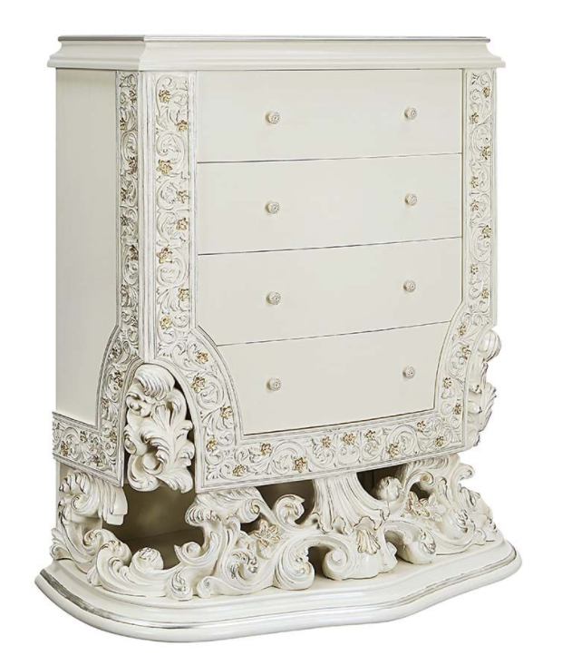The Adara Chest exudes elegance with its antique white finish. Featuring four spacious drawers and a convenient bottom shelf, it combines stylish design with functional storage, making it a perfect addition to any sophisticated space.Read More