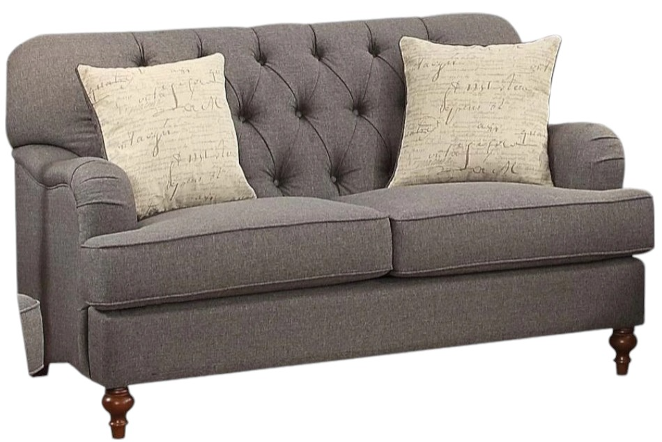 The Alianza loveseat is an ideal choice for any living room. This loveseat features a diamond tufted backrest, tight back and loose seat cushions. The dark gray fabric with brown wooden bun legs in the front and wooden legs , alongside the English curved arms this loveseat is the essence of class and style.Read More