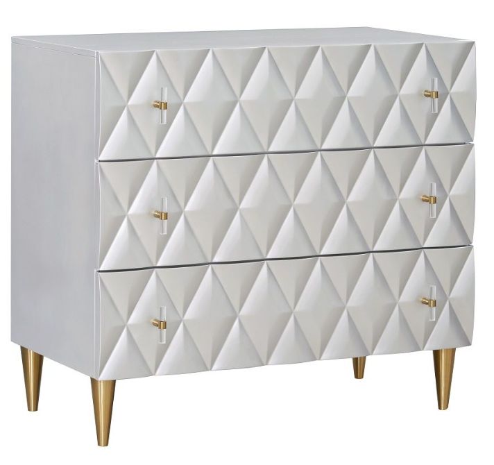 Modern and dimensional, this Anson geometric console cabinet elevates the look of any home with its metallic silver finish and champagne accents. Champagne tapered legs and acrylic drawer knobs with champagne accents add shine to the piece. Three generously sized drawers offer storage clothes, lingerie, or even blankets.Read More