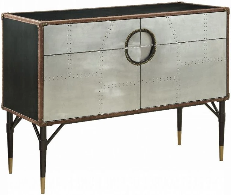 With its riveted patchwork of polished aluminum, the Brancaster console table is inspired by mid-20th-century air travel. This unique console piece features ample storage with two drawers and cabinet space with two doors, all supported by tapered metal legs. A masterful example of form and function.Read More