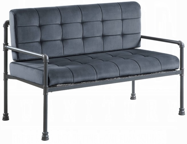 The ACME Furniture Brantley Loveseat features a stylish and industrial-inspired design with a gray velvet upholstery and a sandy gray metal frame, showcasing a unique water-pipe style structure. This loveseat includes two accent pillows for added comfort and visual appeal.Read More