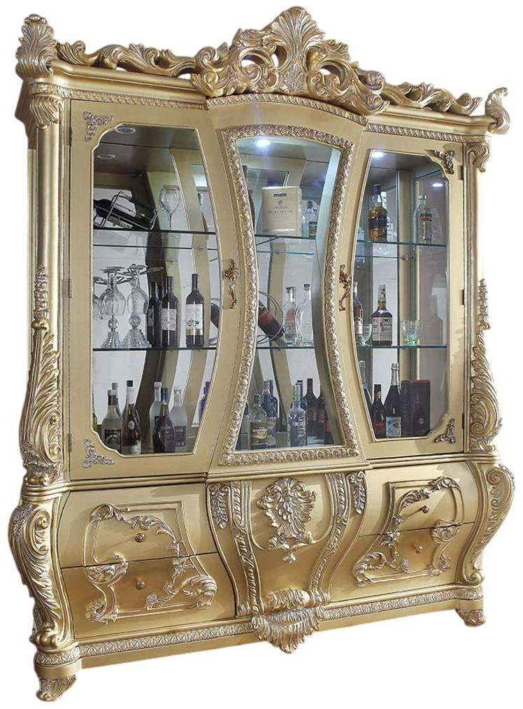 Designed to showcase your collectibles, the curio features glass doors and shelves. The glass doors offer a clear view of your displayed items, allowing them to be admired from every angle. The shelves inside provide a perfect platform to exhibit your figurines, art pieces, or other precious possessions. The curio is equipped with four spacious drawers, providing ample storage space for storing additional items or keeping smaller treasures organized. The drawers are thoughtfully crafted to slide smoothly, ensuring easy access to your belongings. The curio's gold finish lends an air of luxury and grandeur to its overall design. The rich and radiant gold tone adds a touch of glamour, making it a striking focal point in any room.