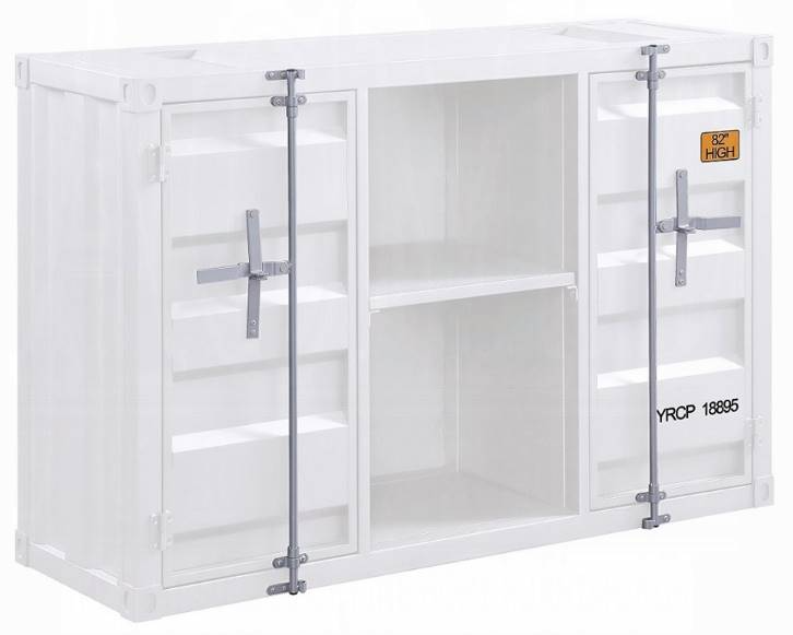2 open compartments (1 metal shelves), 2 doors