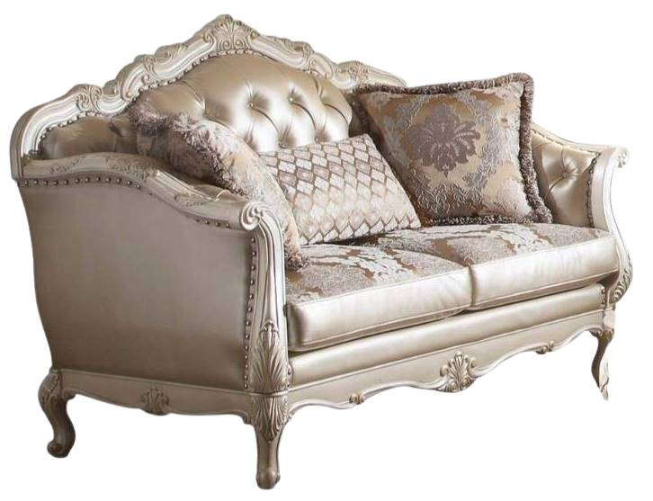 The Chantelle loveseat is filled with romantic wonder. This loveseat features a rose gold PU seat back, floral pattern, and PU seat cushions, with pearl white wood finish, crystal-like button tufted back, arms, and back, and tight back with loose seat cushions.Read More