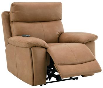 The Chavis power recliner with power headrest features rich brown leather-aire upholstery, smooth power reclining and adjustable headrest for personalized comfort, built-in USB port, plush cushions, and supportive pocket-coil seating for a stylish lounge experience.Read More