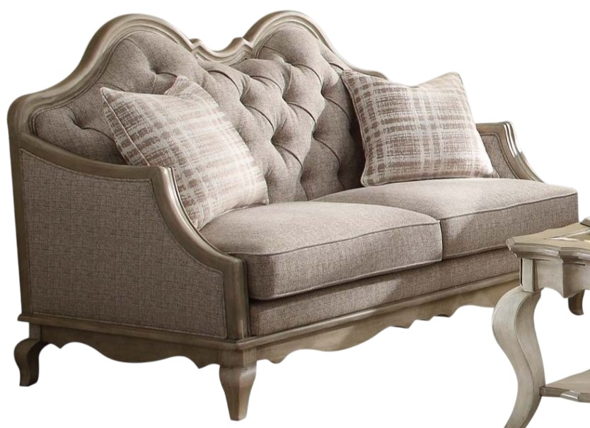 The Chelmsford Antique Taupe/Beige Loveseat by ACME Furniture combines timeless elegance with comfort. Upholstered in soft beige fabric, it features a sturdy frame finished in antique taupe with intricate carved details. Plush cushions and a refined design make this loveseat a sophisticated addition to any living space.Read More