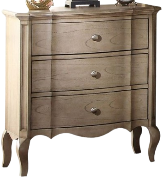 The ACME Furniture Chelmsford Antique Taupe Nightstand is crafted from solid wood and veneers, featuring an antique taupe finish. It includes three drawers with side metal glides for smooth operation, and the top drawer is felt-lined to protect delicate items.Read More