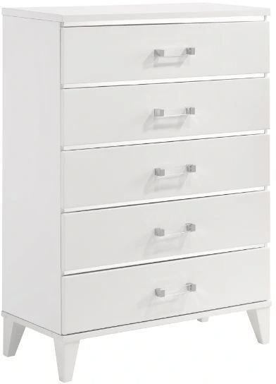 Explore modern simplicity that easily improve your overall aesthetic. The contemporary lines of this chest works perfectly with the temping finish, while decorative sliver trims add depth and reflect light. It offers five storage drawers with clear acrylic bar handles that bring a voguish, high-end feel to the piece.Read More