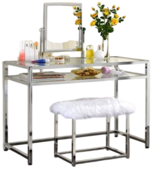 The Coleen 2-Piece Vanity Set combines modern elegance with practicality, featuring a sleek glass top supported by a shiny chrome base. The set includes a matching stool with a padded seat upholstered in fabric, offering both comfort and style.Read More