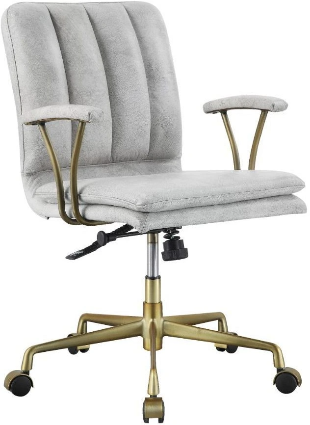 Furnish your office with the Damir high back office chair. This rolling swivel chair has fully adjustable lift height with exceptional lumbar support, and features luxurious top grain upholstery in vintage white with decorative vertical stitching, all beautifully accented by chrome-accented arms and base.Read More