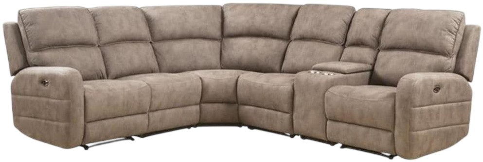 Includes: 3 reclining seats (power motion left-arm facing/right-arm facing and armless recliner), 2 stationary seats (armless chair and curved wedge), console with storage and cup holder