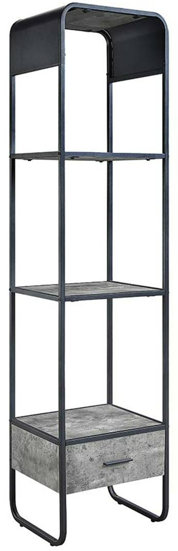 This piece features a concrete gray finish, a black metal frame, open shelves, and a drawer for hidden storage. Users have the option to pair it with the matching tv stand to complete the set or utilize this pier as a bookshelf, as it can stand alone.Read More