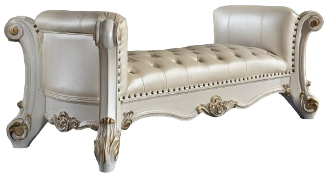 Tracing back to the classical Baroque era, expressed with intent and conviction, this Vendome bench is donned in a pearl PU and an antique pearl finish that is richly accented with gold paint brushed onto the piece by hand.Read More