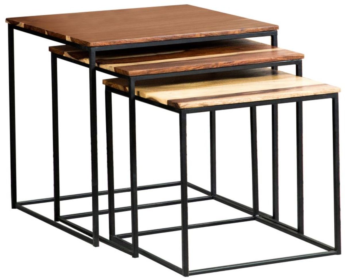 A simplistic set of three wood nesting tables brings convenience and style to your space. Rectangular sheesham tabletops have varying hues of natural wood colors, adding to their aesthetic flair. Each nesting table brings extra tabletop space for essentials and decor. The tables are supported on slim black metal legs. These pieces are ideal for rustic or industrial style decor.