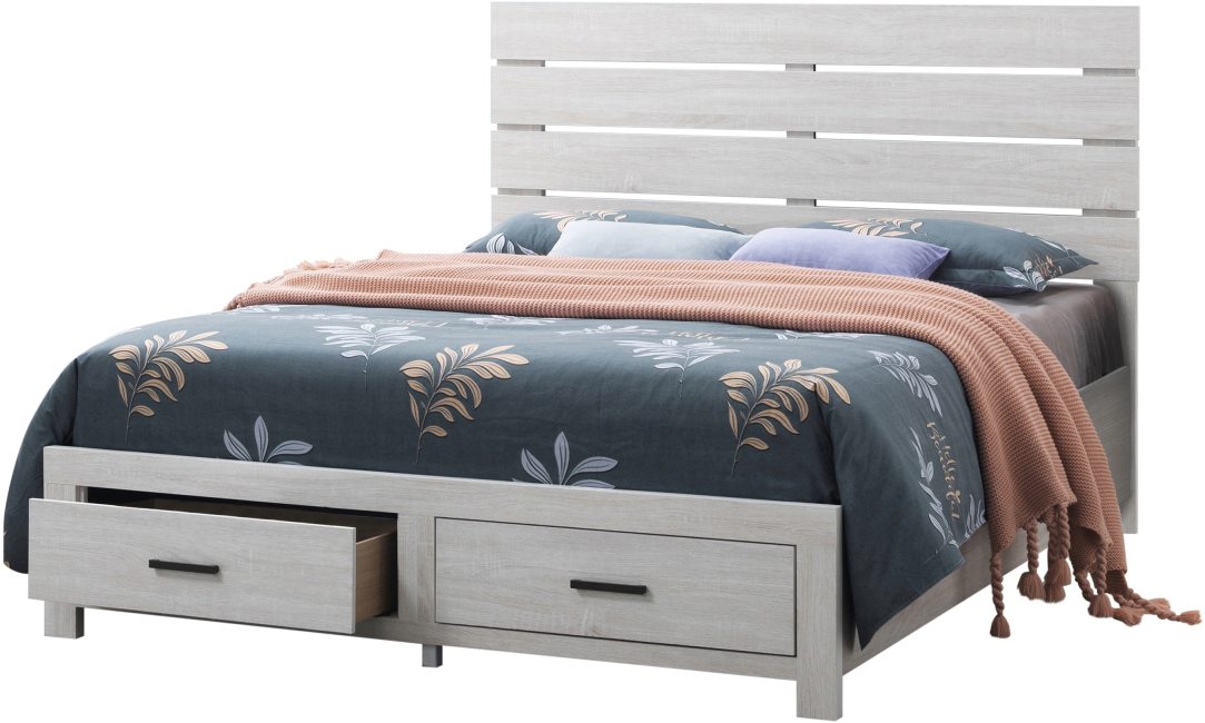 Elevate a bedroom with an exquisite focal point that exudes rich, country vibes. This handsome, rustic platform bed is classically crafted with bold, rustic appeal. A 3D paper veneer makes it easy to clean and maintain. Two footboard storage drawers offer convenient storage space. A plank-style headboard brings it all together with striking, old-world appeal.