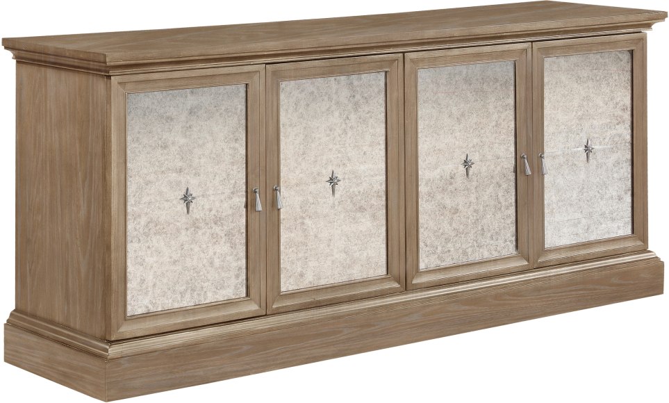 A four-door server is accentuated with antique mirror door fronts to create a rich, classic accent piece. Drawing the eye, this dining room addition is just the finishing touch you've been searching for. Plentiful storage creates space for various types of serveware and myriad accessories and linens. This buffet features Asian hardwood construction and a soft barley brown finish to offer a stylish, durable presentation.Read More