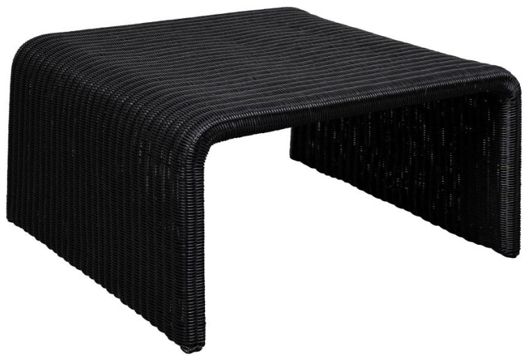 Revive the 70s with a minimalist inverted U-shape coffee table made of black metal and a woven surface for a touch of glam