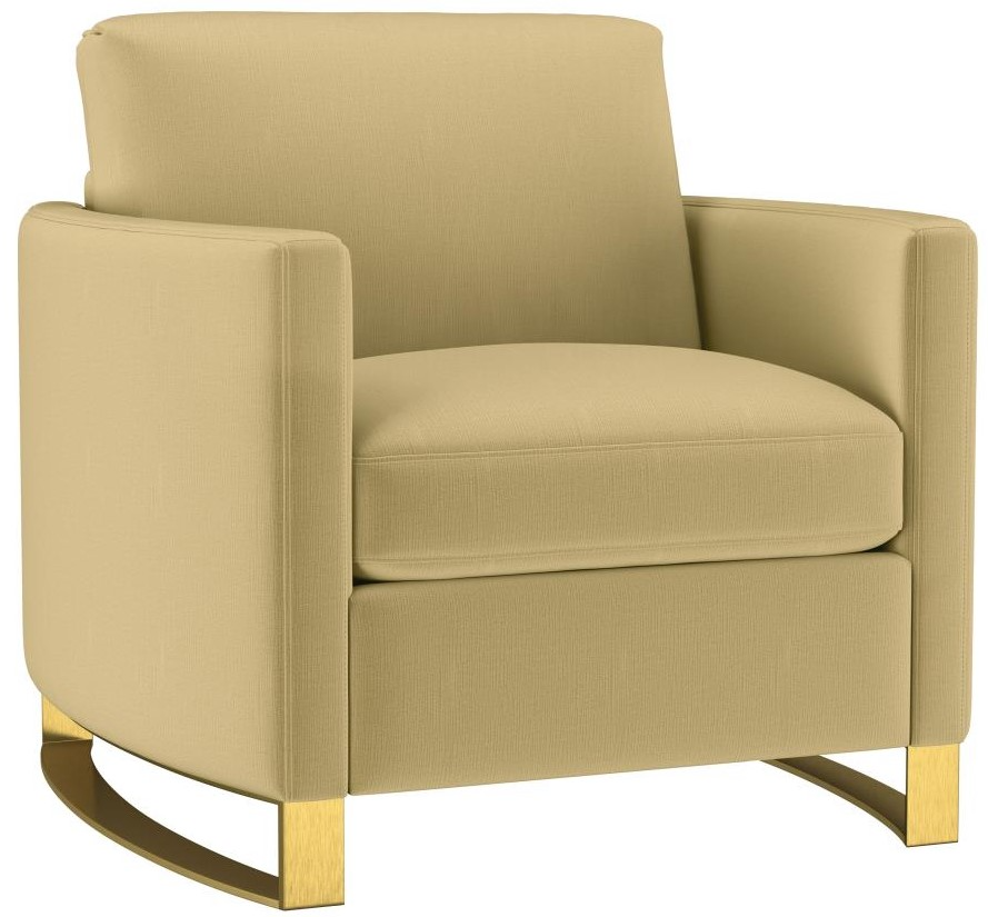 Curved arms and gold-accented stainless steel legs add subtle luxury