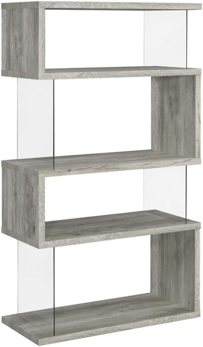The asymmetrical zig-zag design of this contemporary bookcase creates a focal point in any room. Five open shelves in a light grey driftwood finish stack elegantly, supported by clear glass side panels that lend a modern flair to this furniture piece.Read More