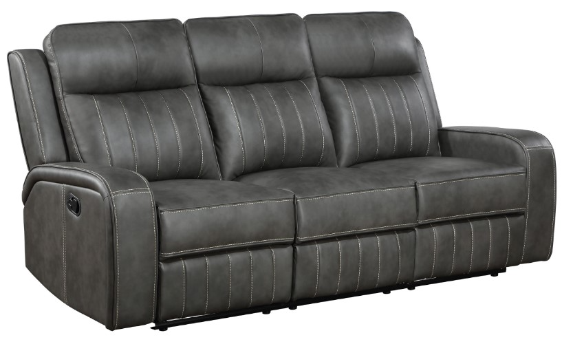 Motion sofa upholstered in smooth grey leatherette with decorative topstitching