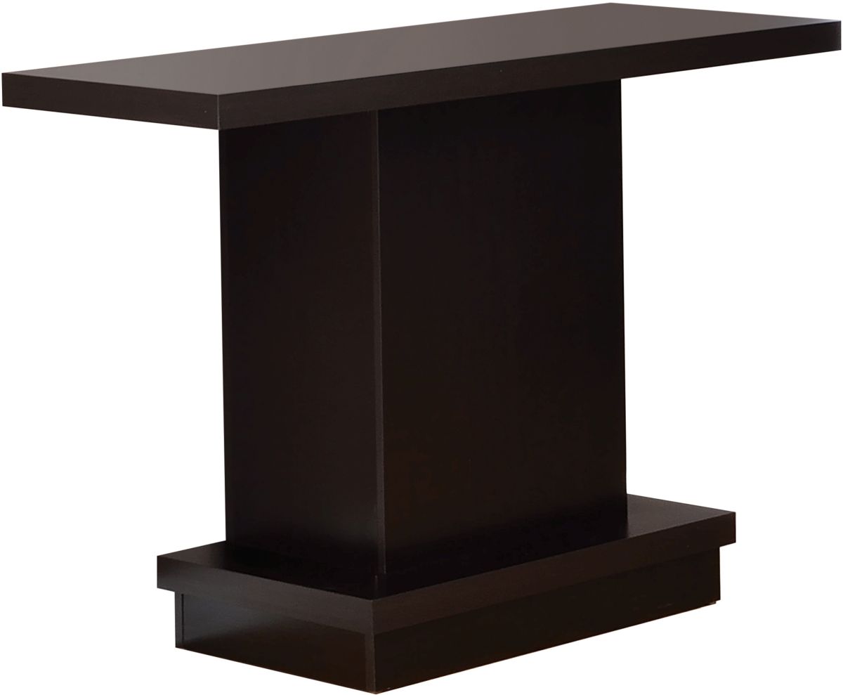 The wide table stand lends the table a sturdy reliability. The table base is crafted in a pedestal style for a bit of shelf space that accommodates a small houseplant. The warm cappuccino finish adds an inviting ambiance to any living room or den.