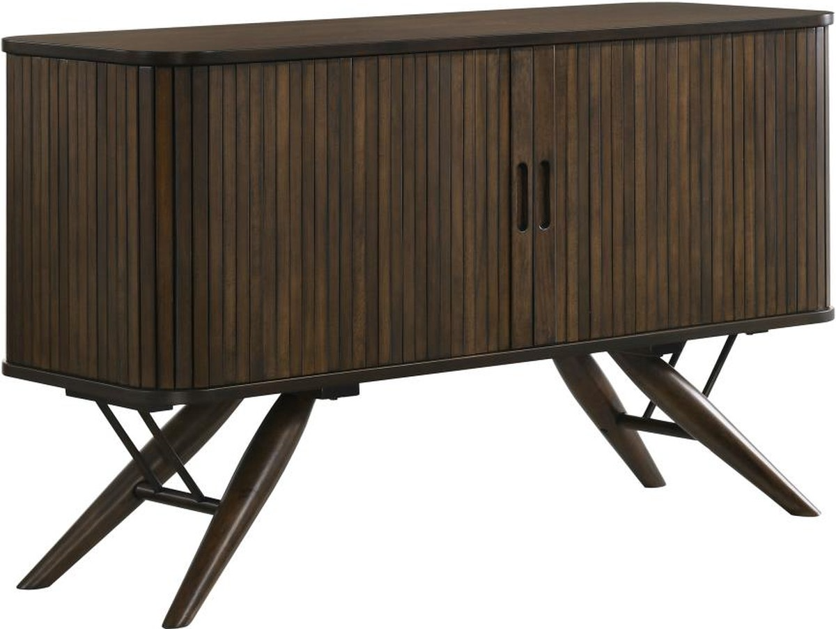Elevate your dining area with this mid-century modern server. Beautifully designed with campaign style influences, this contemporary server rests on striking flared legs that offer a retro-inspired aesthetic. A rich, dark walnut finish brings out charming details.Read More