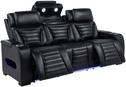 Dual power sofa in black faux leather includes power recline and power headrest adjustment
