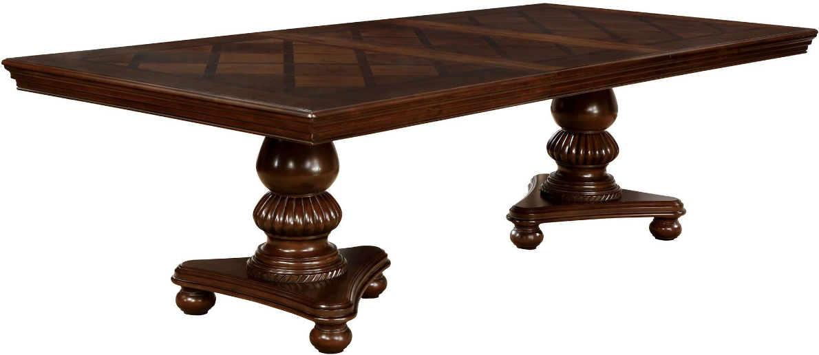 Shine up your silverware, bring out the glassware and get ready for the dinner party of the century with this glorious, traditional style dining table. The ornate double pedestal base provides the perfect structure for the crisscross patterned table top that, with its large 24-inch expandable leaf, can fit all the friends and family you can imagine. Paired with upholstered chairs featuring espresso leatherette, rope-like trim and elegant carved legs.