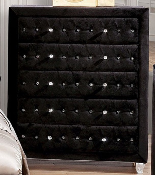 Comforting cushioned velvet-like fabric encompasses this bedroom chest. Admire the glimmering acrylic button tufts, run your hands over the soothing fabric, and easily stock essentials in their cavernous storage drawers. Cabriole feet add a well polished finished as they provide unwavering support to this elegant piece.Read More