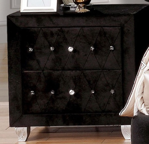 Comforting cushioned velvet-like fabric encompasses this night stand. Admire the glimmering acrylic button tufts, run your hands over the soothing fabric, and easily stock essentials in their cavernous storage drawers. Cabriole feet add a well polished finished as they provide unwavering support to this elegant piece.Read More
