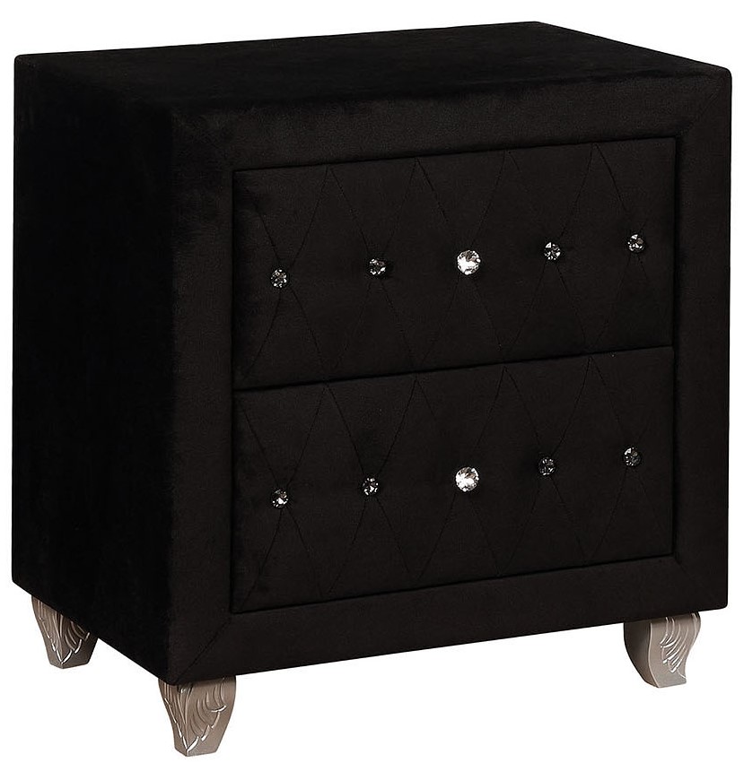 Comforting cushioned velvet-like fabric encompasses this night stand. Admire the glimmering acrylic button tufts, run your hands over the soothing fabric, and easily stock essentials in their cavernous storage drawers. Cabriole feet add a well polished finished as they provide unwavering support to this elegant piece.