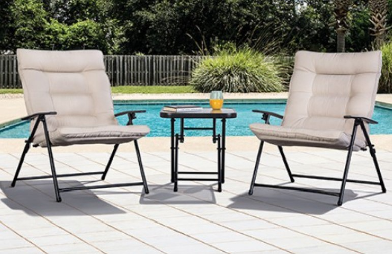 The Bastia 3-Piece Outdoor Conversation Set is a contemporary ensemble designed to enhance your outdoor living space with comfort and style. This set includes two folding chairs and a matching side table, all featuring a sleek black metal frame paired with beige fabric upholstery.Read More