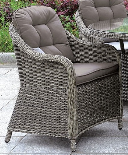 This contemporary patio chairs features comfortable seats with fabric cushions that can be arranged around the tempered glass and umbrella-ready table for an inviting outdoor brunch! With the sun shining overhead and a gentle breeze making the day perfect, this is one chair you will never regret adding to your home.