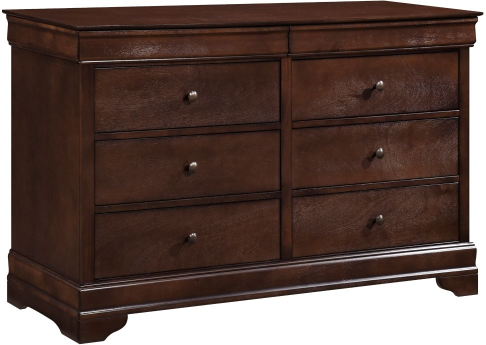 The ever-popular Louis Philippe style is achieved with a glamorous touch in the Abbeville collection. The classic lines of the dresser lend to the timeless look of this collection. Okume veneer is elegantly highlighted with a cherry finish that is further enhanced by the dark bronze tone of the knob hardware.Read More