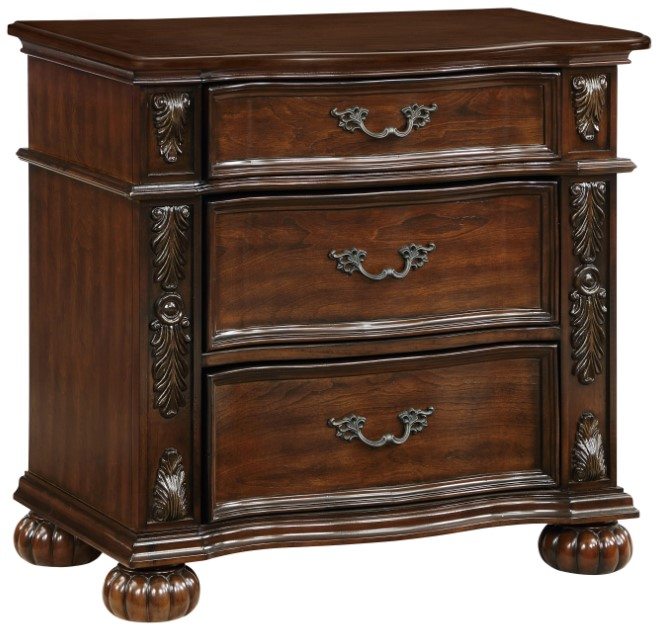 Rich in the aesthetic of Old-World tradition, the design of the Adelina Collection is the culmination of classic accenting that creates an elegant presentation for your bedroom. The serpentine front of the nightstand features framed drawers, fixed-pull traditional hardware, acanthus leaf carvings, as well as bun feet.Read More
