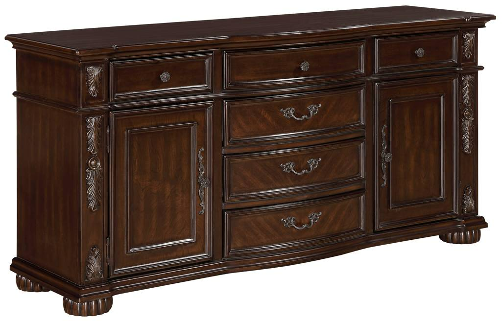 The acanthus leaf carvings and bun feet that support buffet/server provide additional traditional accenting. The serpentine front of the buffet/server features framed drawer and door storage with fixed-pull traditional hardware. Furthering the timeless aesthetic that permeates the collection, is the cherry finish, with gold tipping, over birch veneer and pine solids.
