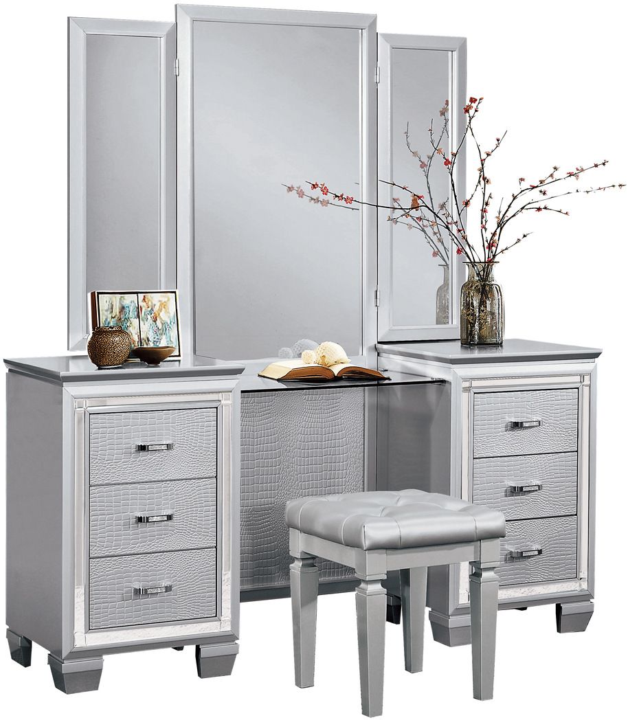 The Allura Collection exudes glamour with its striking design, showcasing a sleek silver finish accented by bold alligator embossing and high-polished crystal-enhanced hardware, beautifully highlighting the vanity dresser and mirror for a luxurious and sophisticated look.Read More