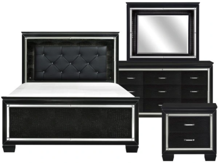 Alligator embossing and high polished crystal-enhanced hardware boldly accent the black finish as does the black faux leather crystal-tufted headboard insert of the collection.