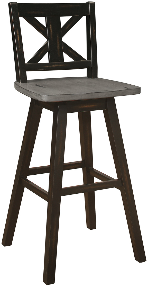 Creating a subtle rustic look for your dining space is the Amsonia Collection. A black sand-through finish graces the solid rubberwood 29-inch divided X-back swivel counter height chair, highlighting the veneer.Read More