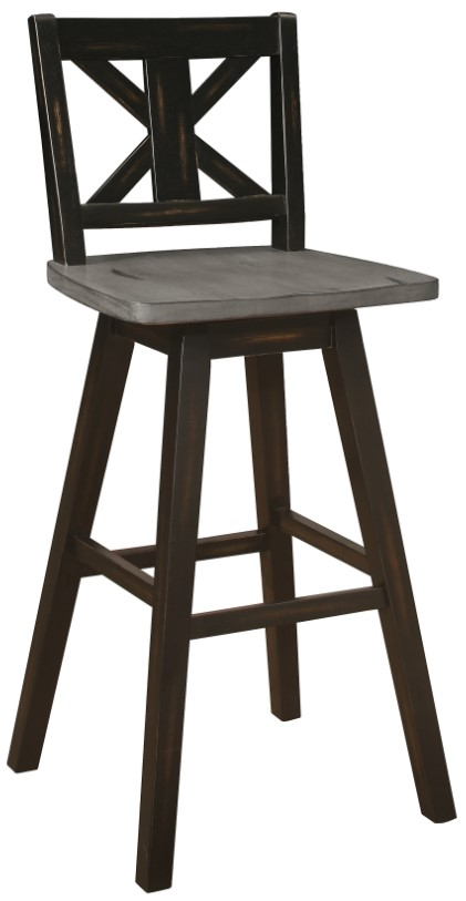Creating a subtle rustic look for your dining space is the Amsonia Collection. A black sand-through finish graces the solid rubberwood 29-inch swivel X-back counter height chair, highlighting the veneer.Read More