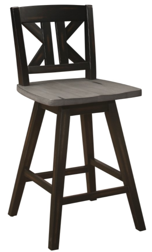 Creating a subtle rustic look for your dining space is the Amsonia collection. A black sand-through finish graces the solid rubberwood 24-inch divided x-back swivel counter height chair, highlighting the veneer.Read More