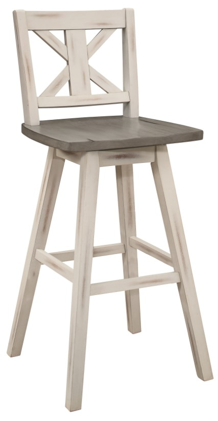 Creating a subtle rustic look for your dining space is the Amsonia collection. A white sand-through finish graces the solid rubberwood 29-inch swivel X-back counter height chair, highlighting the veneer.Read More