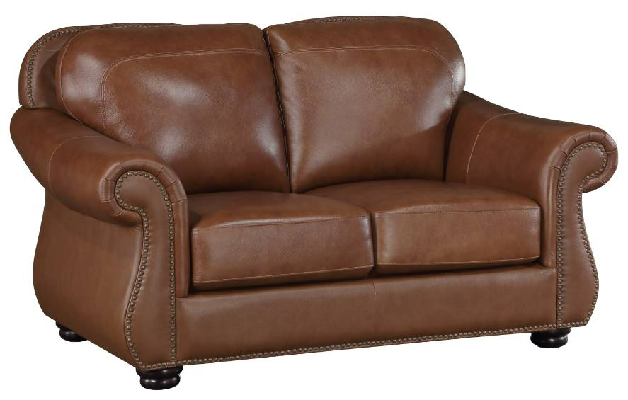 The traditional style of your home is perfectly complemented by the addition of the Attleboro Collection. Plush seating is covered with camel brown top-grain leather where the hand touches, and faux leather-match covering the remaining areas. Rolled arms elegantly curve, their fronts and the base rail of the loveseat accented with nailhead trim.Read More