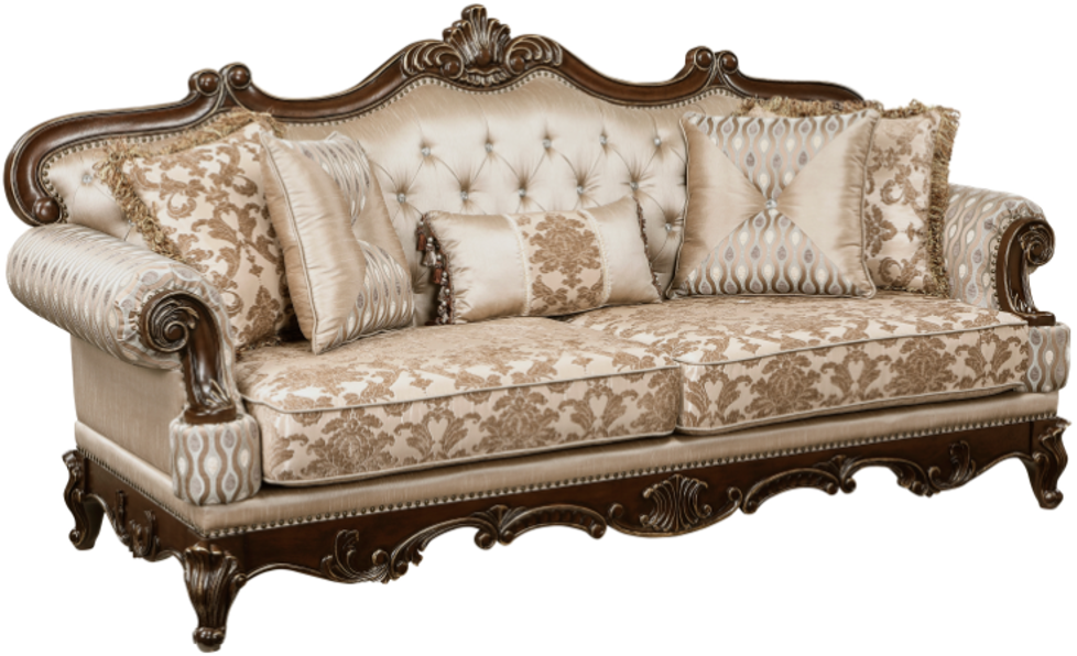 Faux crystal-tufted, and trim detailed, the sofa also features five coordinating toss pillows. Furthering the traditional aesthetic are the round arms and contoured arm fronts.