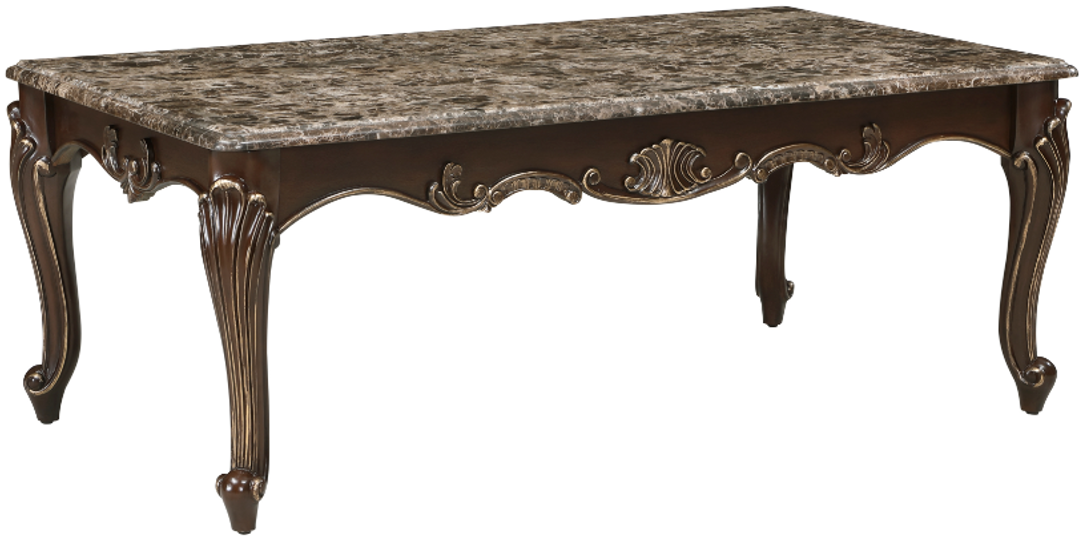 An elegant combination of traditional elements is paired to create the timeless look of the Balthasar Collection. Genuine marble tops the cocktail table, while supported by classic cabriole legs. The table’s apron features decorative scroll detail, solidifying the traditional styling. Complementing the brown tone marble is the cherry finish, accented by gold tipping.Read More