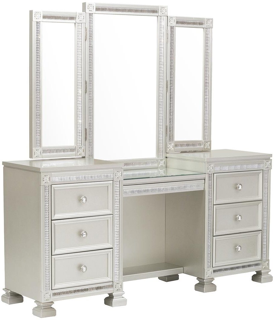 Modern glamour is exemplified in the design of the Bevelle Collection. Acrylic crystals frame the vanity dresser with mirror, reflecting the light to create eye-catching drama.Read More