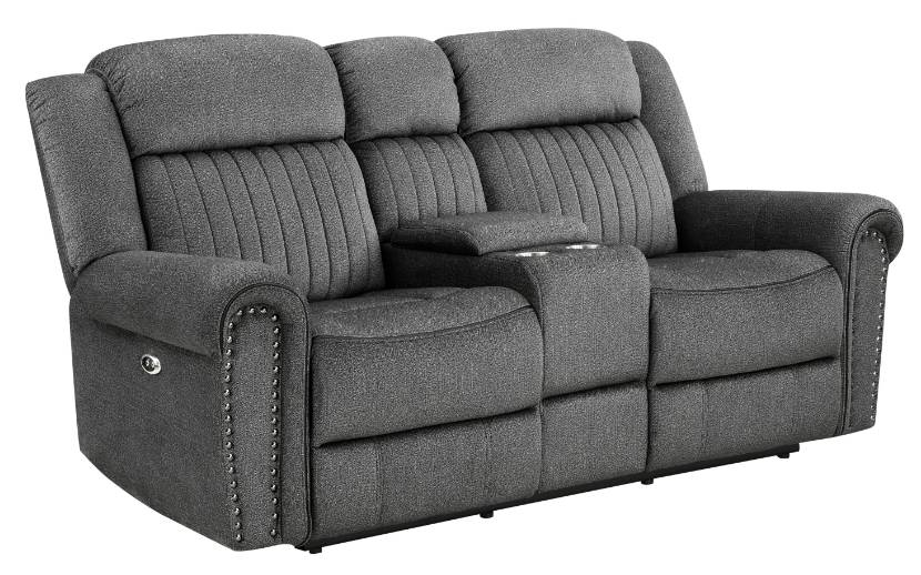 Additional functionality comes in the form of the love seat’s console, its lift-top hidden compartment and cupholders providing a convenient spot for beverage and accessory storage. Plush seating is defined by the contoured stitching, while the arms of the love seat are accented with nail head trim. Charcoal-hued textured microfiber covers the seating group, providing soft touch and decorative versatility.