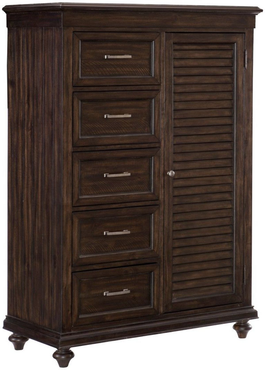 The solid transitional styling of the Cardano Collection creates an impactful design presence in your home. Utilizing distinct accent techniques – plank effect, rasping, saw marks – and pairing them with traditional framing and a rich finish – driftwood charcoal over acacia solids and veneers – creates dresser that is a perfect fit for your bedroom. Pewter finished hardware provides subtle contrast to the wood’s dark finish. The drawers and door of the wardrobe chest open to reveal ample space for your personal items.