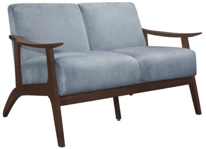 The frame of the Carlson collection recalls a time when simplicity of profile was the height of style. The streamlined design of the love seat's subtly sloped wood arms and legs is finished in dark walnut which serves to highlight the blue-gray velvet covering.Read More